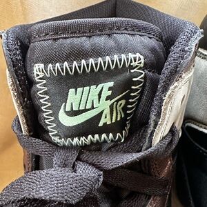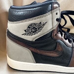 “The Air Jordan 1 Retro High OG 'Patina, also known as the Jordan 1 'Rust Shadow, presents an aged take on the iconic sneaker. A black tumbled leather upper is offset with gray nubuck on the heel and collar overlay, further contrasted against a distressed bronze finish on the forefoot overlay, Swoosh and eyestay. Additional details include a woven logo tag surrounded by zigzag stitching atop the black nylon tongue and 'Nike Air' branding in a contrasting pop of mint green. An off-white midsole amplifies the high-top's vintage treatment.”
