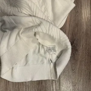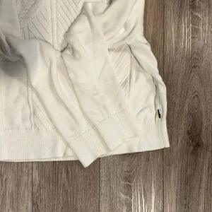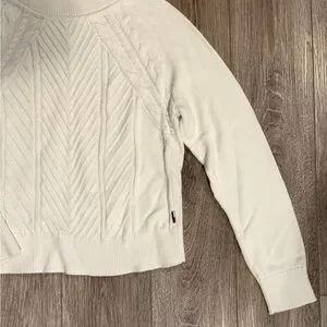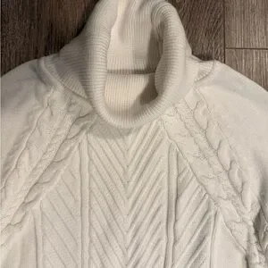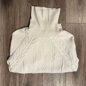 Chic off-white turtleneck with cable knit design. Ideal for warmth and style.
