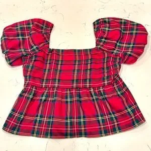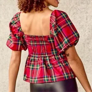 Elevate your style with this chic plaid puff sleeve blouse. Perfect for the holidays, this red peplum plaid top adds an elegant touch to your wardrobe. Square neckline, puff sleeves, pleated front and elastic back. So nice! 🎄
