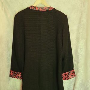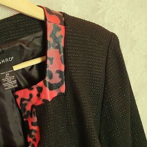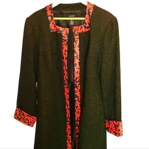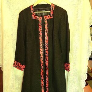 Ashro Black Trench Coat with Faux Red Leopard Print Trim, Gold Threading Size 20