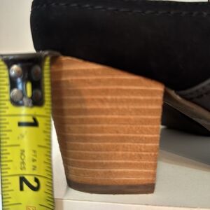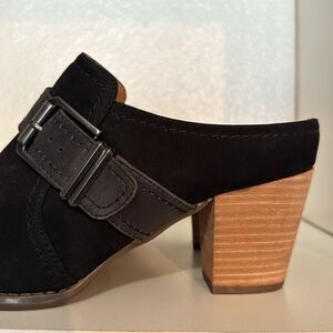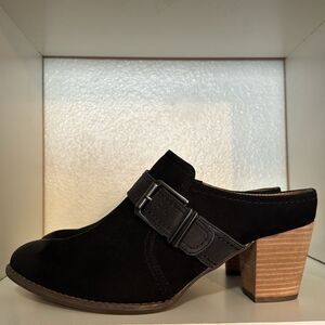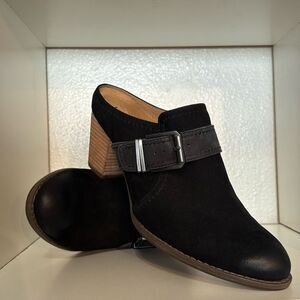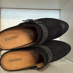 Vionic Black Suede Block Heel Mules Buckle Slip On Comfort Shoes Minimalist Everyday