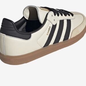 Classic Adidas Samba with cream upper. Black stripes and heel. Tan rubber sole.