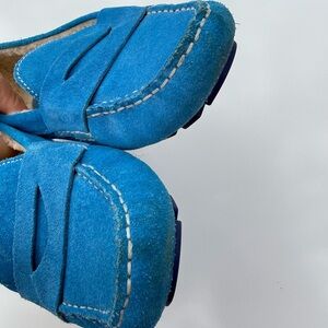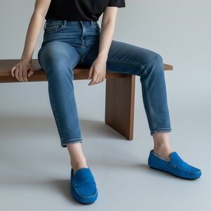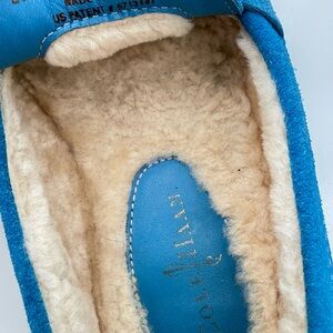 Cozy, stylish, and comfort-driven, these Cole Haan Women’s Driving Moccasins feature a rich blue suede upper and a plush shearling-lined interior perfect for cooler weather. Designed with a flexible NIKWAX rubber driving sole and classic loafer stitching, these slip-ons blend durability with everyday ease. Gently used with light wear—still plenty of life left.