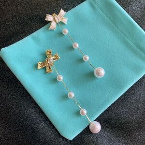 New, comes with "tiffany blue" velvet jewelry pouch. Gorgeous and dazzling. Stainless steel material and 18K plated gold with faux pearls. The bow and long fringed pearl earrings can be worn separately. 2 in 1 ways to wear. The post is sterling silver, hypoallergenic.