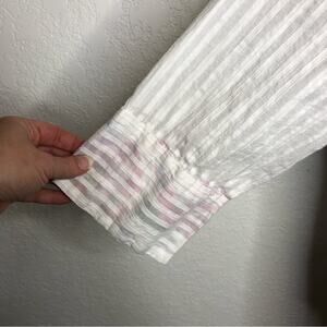 Antica Sartoria white striped floral embroidered button down tunic top. Collared with full button down front. Button cuff sleeves. Solid semi sheer stripes. Floral material inside sleeve cuff. Double side pockets. Midlength sleeves. Size Extra Large XL. Excellent preowned condition. One tiny spot on collar.
