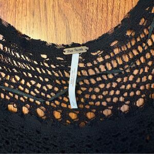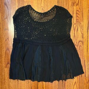FREE PEOPLE Black Crochet Knit Top with Sheer Chiffon Hem – Size L