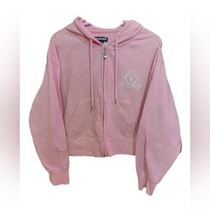Stylish pink cropped hoodie with front pockets and zipper. Features Playboy logo on the chest.