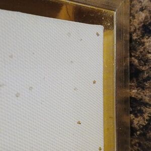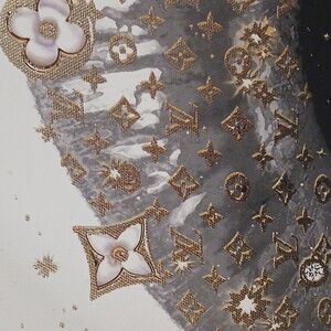 Faux Louis Vuitton wall hanging. White canvas back with Grey lips and gold glitter LV emblems. Very pretty and stylish.