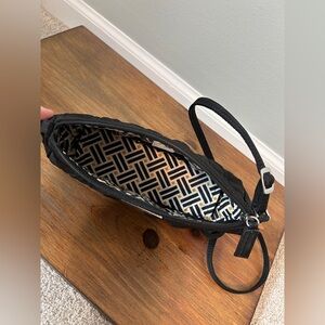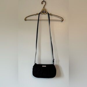 Vera Bradley quilted purse in used great condition. Featured black quilted exterior with adjustable shoulder strap. Interior is clean with fun fabric iconic to Vera Bradley brand. No signs of wear noted overall to exterior, possible minor stain at interior due to rubbing.