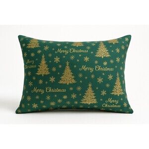 This festive 2-pack of lumbar pillow covers features a deep green backdrop with metallic gold Christmas trees, snowflakes, and cheerful holiday script. The smooth woven velvet-like fabric carries a soft sheen that brings an elevated holiday touch to any room. Each cover measures 12 x 19 and is compatible with standard 12 x 20 inserts for a comfortably full and well-shaped fit on sofas, beds, benches, or accent chairs.