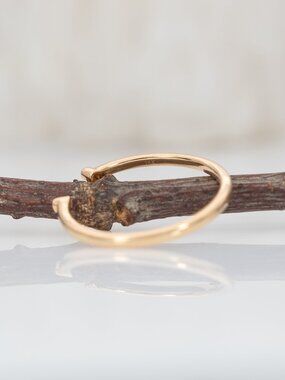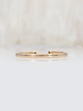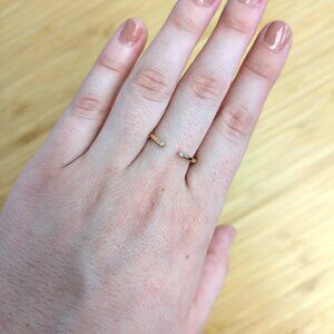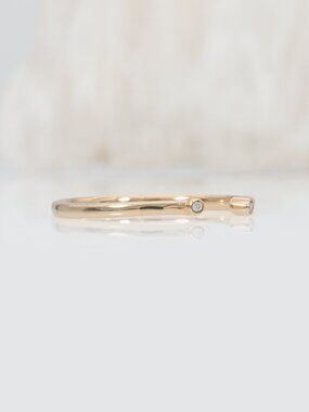 A dainty natural earth-mined diamond open band in solid 14k yellow gold, featuring two bezel-set diamonds and a slim, stack-perfect design.