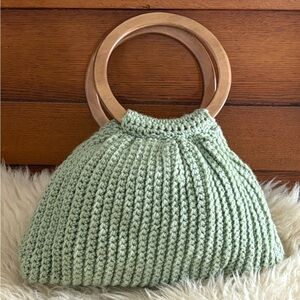 Hand Knit Sage Green w/Flower Wooden Handle Baguette Bag