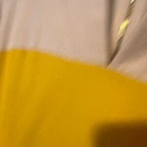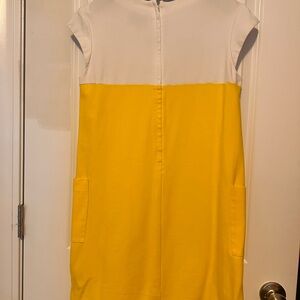 Vibrant mini dress with a bold yellow and white design. Features a sleek silhouette and practical pockets.