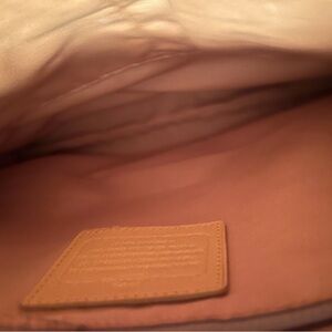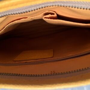 Elegant Coach crossbody with signature pattern. Features beige and yellow accents.
