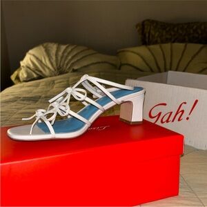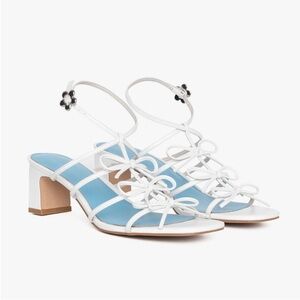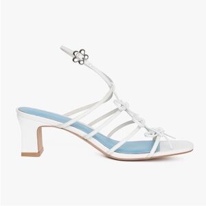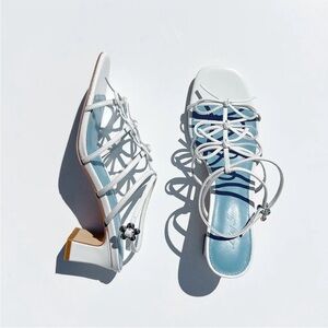 White/Blue Sandal Heel with Bow Accents and a floral clasp for an ankle strap closure