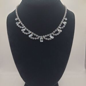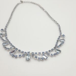 This stunning silver toned necklace features sparkling light blue crystal accents, perfect for adding a touch of elegance to any outfit. Ideal for special occasions or everyday wear.