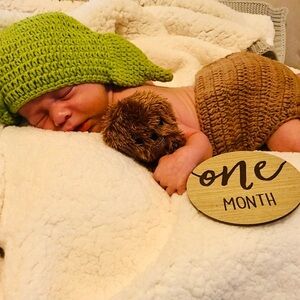 Adorable green knit Baby Yoda hat and diaper cover set for your little one. Perfect for photoshoots and special occasions.