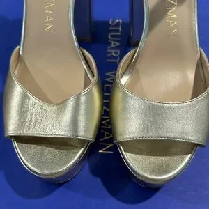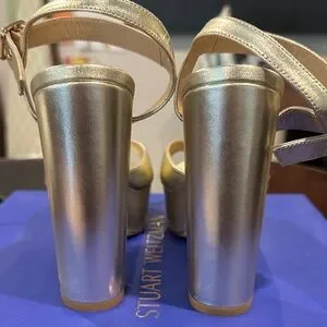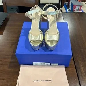 Chic metallic gold heels by Stuart Weitzman. Features an elegant strap design. Ideal for stylish outings. Please see photos and video for signs of wear.