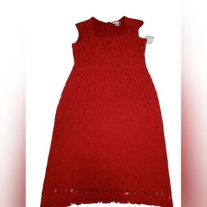 New with tags ✨ Fully lined, elegant red lace overlay with a square neckline and back zip closure. Perfect for weddings, cocktail parties, or any special event.
