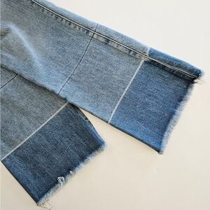 Statement cuffs and a subtle flare define this sky-blue, premium denim pair from Derek Lam 10 Crosby. Features a zip fly with button closure, five-pocket silhouette, and mid rise. Belt loops, contrast topstitching, silver-tone hardware. Flared and released cuffs with frayed trim. These are in excellent like new condition.