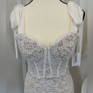 Luscious lace adorns this flawlessly structured gown by City Studios, a mesmerising floor length dress subtly sparkled with gorgeous glitter. Shoulder ties add an extra accent of elegance to this stunning piece.