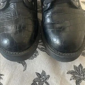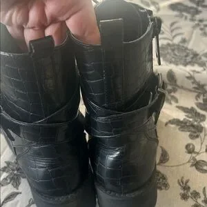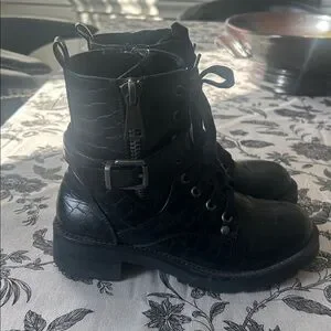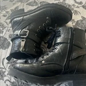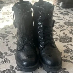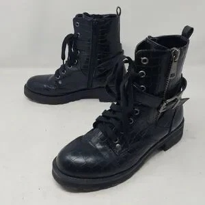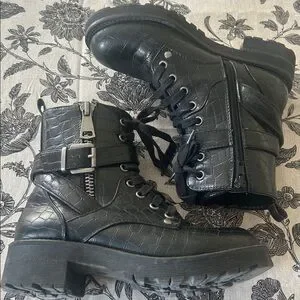 These Mia Marcell Black Faux Croc Embossed Leather Combat Ankle Boots are in very good used condition with some very minor wear.
