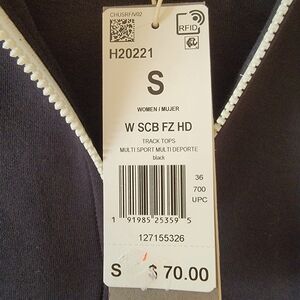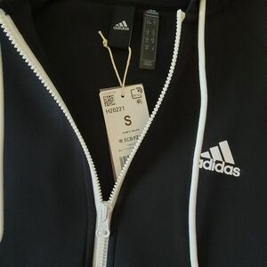 New with tags, Stylish women's Adidas zip-up hoodie in black and white. Features iconic logo and stripe design.