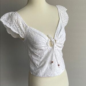 Charming white blouse with eyelet design. Features a tie front and flutter sleeves. Ideal for a fresh, romantic look.
