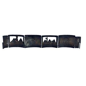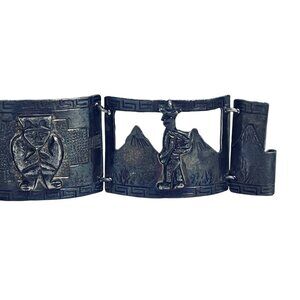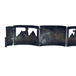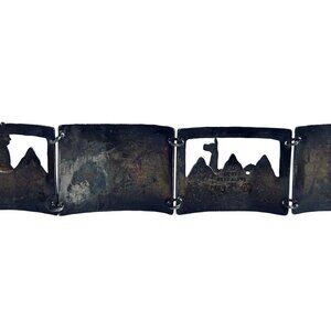 This vintage Peruvian bracelet showcases intricate Andean-inspired designs etched in sterling silver panels. A timeless piece reflecting cultural artistry and craftsmanship. It has open cutwork on 2 of the panels.