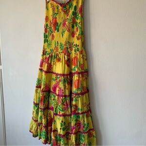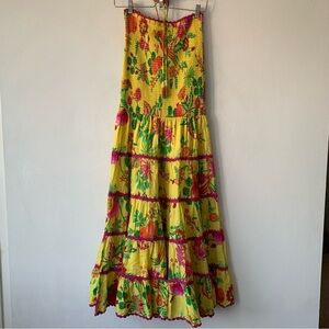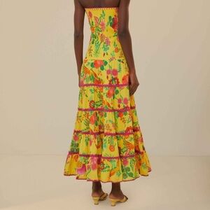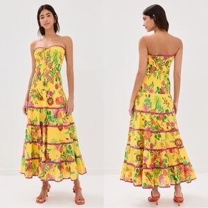 Farm Rio Delicate Fruit Garden Yellow Smocked Strapless Halter Tiered Maxi Dress