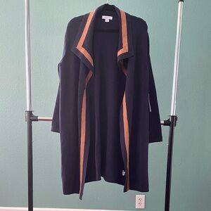 Liz Claiborne Open Front Long Cardigan Sweater Navy Tan Trim XXL Soft Knit Drape