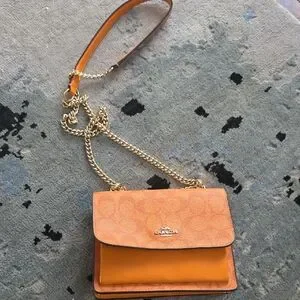 Eye-catching orange Coach crossbody bag. Features elegant gold chain strap. Perfect for adding color to any outfit.