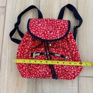 LeSportsac Small Edie Backpack in red nylon with a white and blue floral pattern.