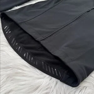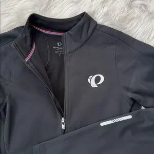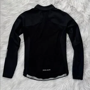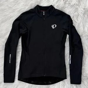 Sleek black soft shell cycling jacket by Pearl Izumi. Ideal for cycling and outdoor activities. Features a full zip, fleece lining, reflective accents, partial elastic arm openings, internal back gripper on seam, and three section back pocket.