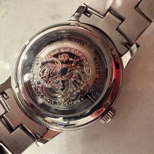 Stylish Kenneth Cole watch with a silver and black design. Features an elegant skeleton dial. Perfect for any occasion.