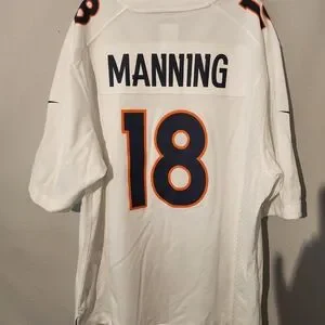 Pre-owned in great condition. This is a size L Nike Stamped Denver Broncos Peyton Manning #18 Jersey. 100% polyester, ptp measures 23" and length about 31.5"