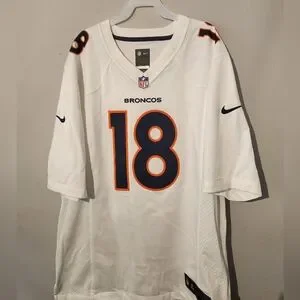 Nike Broncos jersey in white with orange and navy accents. Features number 18.