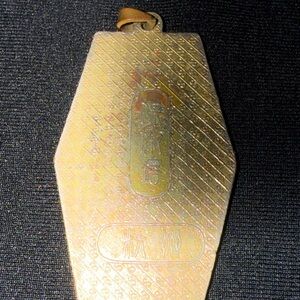 Hexagonal pendant featuring a pagoda design. Gold and green colors.