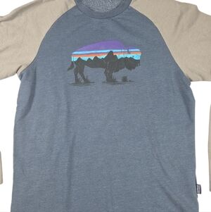 The Patagonia Fitz Roy Bison Lightweight Crew Sweatshirt in men's size medium and blue color is a versatile and comfortable pullover garment perfect for outdoor activities like walking and hiking. Made from a blend of polyester, spandex, and cotton, this sweatshirt features a graphic print of a bison logo on the front, giving it a unique and nature-inspired look. With a crew neck and long sleeves, this sweatshirt is machine washable and designed for a regular fit, making it a practical and stylish choice for all seasons.
