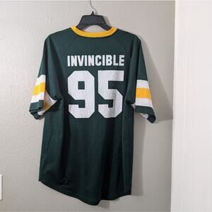 Green jersey with yellow and white stripes. Features 'Invincible 95' on the back.