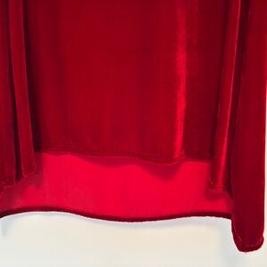 Beautiful crimson velvet oversized top with slight ruching across back waist, bias-cut banding at wide scoop neckline, cuffs, and hem.