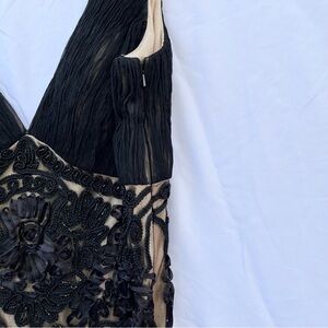 • Size 10. Black and cream overlay. Beaded embellishments scattered throughout the entire dress. Lace illusion detailing. Cocktail dress. V-neck. Padded. Hidden zipper closure. Nude lining. Mini dress. Hugs the figure.