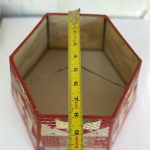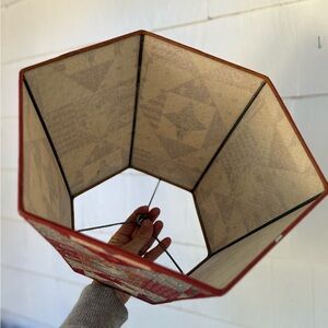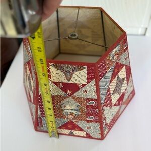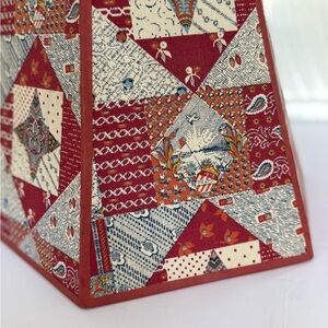 Colorful patchwork fabric lampshade with red and blue patterns. Perfect for adding vintage charm.