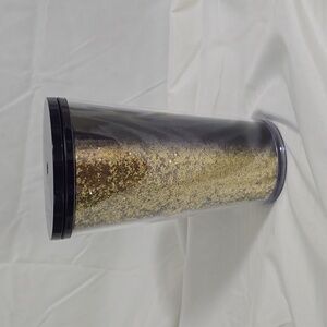 Starbucks16oz grande tumbler with a sleek black and shimmering gold ombre design. Starbucks logo front and center. 2020 holiday collection. Navy blue lid. No straw. Ideal for cold beverages.