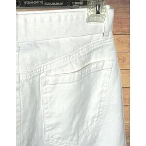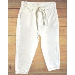 GB brand off-white cotton denim pants with a matching tie belt. Zip and button fly, 5-pocket design. Cropped fit with casual rolled cuffs. Waist measures 31", inseam is 26.5" (can be unrolled for more length). Belted high waist adds a flirty chic touch and flatters the figure. Soft neutral tone and breathable 100% cotton make these perfect for smart casual looks. Easy to pair with tanks, blouses, or knits. Excellent pre-owned condition.