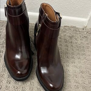 Chic dark brown ankle booties by Zara. Features stylish buckle detail. Perfect for versatile wear.