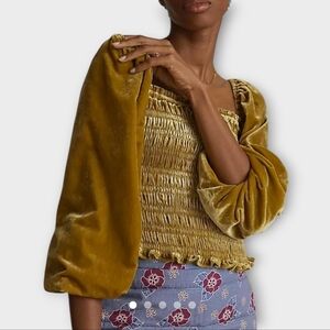 NWT ANTHROPOLOGIE Velvet Puff Sleeve Smocked Top Blouse In Gold Mustard Small