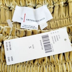 NEW WITH TAGS - ANTHROPOLOGIE - Super Soft Plush Velvet Top Blouse Shirt in a beautiful glowy golden mustard color. Size Small. Laid flat unstretched it measures approx. 13.5" armpit to armpit ( Super Stretchy Elasticized Smocked), 24" top shoulder to cuff, 13" neckline to hem. Excellent NEW WITH TAGS condition. Smoke/ Pet free environment. Bundle purchases to save greatly on shipping! #2/9