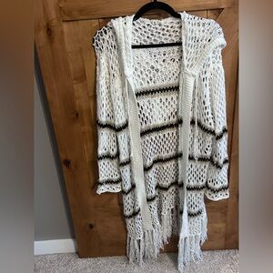 POL Crochet Bell Sleeve Long Hooded Open Cardigan Tassel Stripe- Small