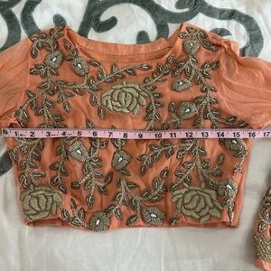 Absolutely stunning custom Indian peach Lehenga set! Comes with embroidered top, lehenga and duputta. Worn twice great condition! Top has marks on the sleeves which can be seen in the picture. Absolutely stunning piece. I wear a US 4-6 and it fits perfectly. Measurements shown, please ask if any specific questions